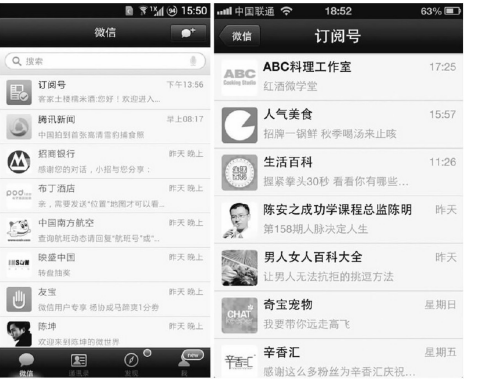 (1)订阅号折叠功能。对微信上众多公众账号、营销账号影响最大的功能就是订阅号折叠功能。订阅号折叠将所有的公众平台进行折叠,用户订阅的营销账号都被收在“订阅号”里。用户必须先进入“订阅号”中,从众多订阅的营销账号中选择自己感兴趣的进行阅读。这一功能,能够免去用户被大量营销信息刷屏的烦恼,避免微信走上微博被营销信息充斥而造成价值下降的老路。但从企业微信营销账号的角度出发,则无疑是一次严重打击,订阅号折叠以后,公众账号无法在醒目的位置凸显自己的营销信息,营销效果将急剧下降。有研究表明,打开订阅号的用户,大部分只会将目光停留在前3个公众账号上,如此稀缺的资源,定将引起营销业者的激烈争夺。