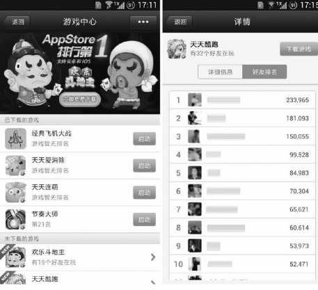 (2)游戏中心。微信5.0版本第一次将游戏引入移动端,并赋予游戏以社交属性。“经典打飞机”、“天天爱消除”等游戏都是经典游戏的移动化产物。本身并不新颖、画面并不美观、操作并不简便,但却长期占据APP下载的榜首。其中最大的原因就在于其社交属性,基于微信的庞大用户群体,如何提升游戏积分在好友中的排名的意义已经远远超过了游戏本身给用户带来的感官体验。可以说,游戏中心是微信多年培养、维系用户社交功能的结果。未来,游戏积分、游戏道具等必将在微信生态体系中发挥更大的作用,引领微信未来的发展。