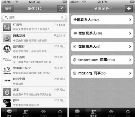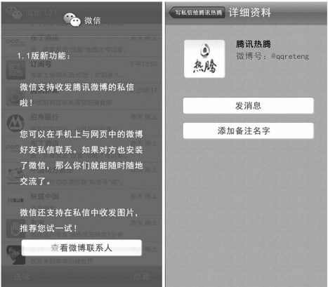 不过短短两个月,来自用户的体验反馈,让微信的研发团队清晰地认识到1.0版本的不足和亟待改进的内短板。3月21日,1.1版本正式发布,微信打通了腾讯微博,允许微信用户以私信的方式发送图片;而在移动对话端,则主要打通了手机通讯录,支持手机通讯录的搜索,实现了QQ账号、微信账号、手机通讯录的“三位一体”的账号关系体系,形成了微信所独有的移动用户生态系统。截至1.1版本发布,微信“熟人社交”、“强互动”的标签已成为骨子里面的基因。