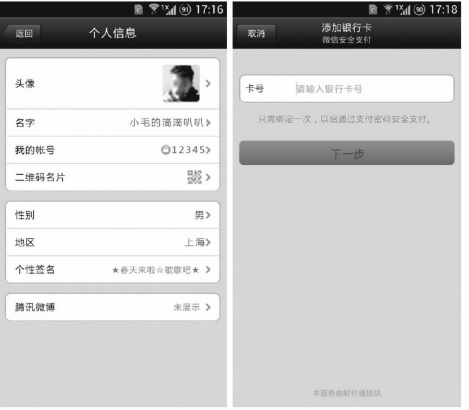 (3)在线支付。微信5.0在线支付功能的推出,旨在利用人们碎片化的时间,满足移动用户碎片化的小额交易的需要。虽然目前的在线支付功能仍处在萌芽状态,开放程度尚有挖掘空间,支持的商户还比较少,想在微信上捞金的大量零散商家尚未接入微信支付、以内容传播为主的公众账号也并未接入微信的在线支付功能。但展现出来的潜力是巨大的,基于逐步成熟的在线支付功能,未来的微信,将能真正打通线上线下交易,移动用户可以随时随地进行金融交易、实物与虚拟货品的购买,将对支付宝形成强有力的冲击,促进我国的电子商务逐步向着移动化的发展方向发展。