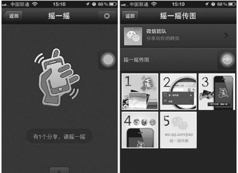 2011年国庆,微信在既有功能体系下,增加了后来为大家所熟知的“摇一摇”和“漂流瓶”功能,3.0版本正式呈现在用户面前。将支持的手机号段扩展至港、澳、台等地,拓宽了微信的人群覆盖面积,“摇一摇”和“漂流瓶”功能则加速了微信社交属性的推进力度。作为一种独特的信息输入方式,“摇一摇”在满足移动用户趣味性的同时,为日后加载更多的功能奠定了良好的群众基础。