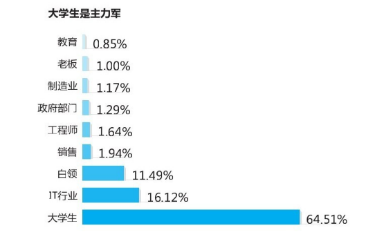 大学生之所以是微信用户的主力军,主要原因有两个:①大学生拥有其他职业无法比拟的时间优势,拥有大量的碎片时间,上课(不提倡)、逛街、沟通交流等,大学生都能找到微信的使用机会。②大学生对移动互联网的认识力度大,对移动应用有着深刻的认识和全方位的使用需求。细数下来,聊天、购物、在线支付、休闲娱乐、秒杀团购等似乎都是大学生们的最爱,而其对实时移动定位技术、附近商家推荐技术的依赖也较大。这两者共同造就了微信用户的“大学生化”的显著特点。