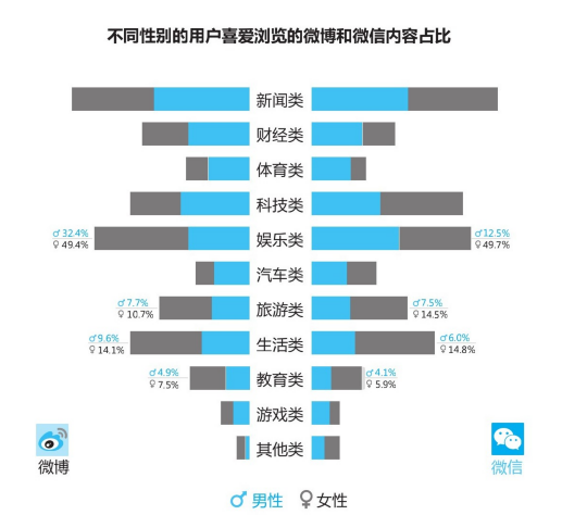 从上图可以看到,除去新闻是男性和女性用户共同关注的内容,在其他领域,不同性别的用户的微信功能需求差异性巨大。由于不同性别用户的特点和登录微信的目的的差异性明显,女性用户对生活(商超优惠信息)、旅游(门票优惠、风景欣赏)、娱乐(八卦)更为热衷,而男性用户则对体育(球星、比分)、财经(股票资讯)、科技(最新科技产品)等领域的信息更为偏爱。并且由于性别特征的不可逆转性,决定了这种发展格局必将长期甚至永久存在。