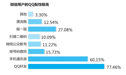 这一局面的形成,一方面是由于微信打通了QQ好友和手机通讯录的好友功能,让微信用户在添加好友时可以一键完成,省略了意向账号的查找和输入的过程,方便的导入过程吸引微信用户将好友从PC端移植到移动平台上。其次,任何即时聊天工具的发展,都是从熟人间的交流和互动逐步向陌生人的沟通过渡的,微信在发展初期,宣传重点也集中在能随时随地与好友进行交流,而用户好友最大的来源就是手机的通讯录和QQ好友,这是聊天工具在发展初期所必须经历的阶段;再次,微信能够完全打通QQ,在微信上能够实时接收QQ离线消息,这大大拓宽了微信信息的来源,注定了微信巨大的QQ黏性。