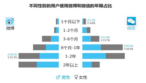 (2)女性成为微信发展的重要推动力。根据缔元信在2013年下半年推出的《社会化媒体用户分群及因素研究》报告,刚刚用上微信(使用一个月以下)的女性用户比例大大高于男性用户,使用一年以下的微信女性用户比例也高于男性用户。在使用微信的女性用户群体中,有4%左右的用户第一次使用微信的时间在一个月以下,相比较男性用户1%左右的规模占比,显示出在“微信新人”领域,女性用户做出的贡献更大;而将研究范围放大到一年以内的微信新增用户上,女性用户仍然以35%左右的占比领先于男性用户的28%,显示出女性用户在过去的一年时间内成为了微信更加重要的推动力。