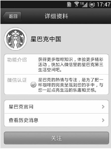 正因如此,星巴克一直在社交媒体上不遗余力地拓展领地。在开通微信之后,星巴克利用丰富的门店资源来做公众账号的二维码推广,同时也通过微博、星享卡会员项目、平面媒体等多种渠道,把微信的通道告诉消费者。凭借良好的推广渠道和品牌感召,星巴克在短时间内就迅速累积了40万粉丝。