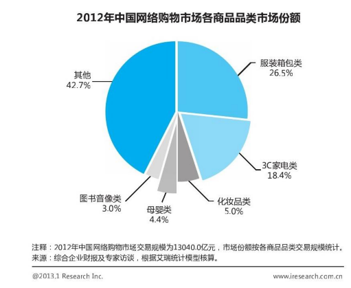 艾瑞咨询2012年的统计数据让观察者们看到,以服装箱包与3C家电类为首的行业在网络购物行为中占据多数市场份额,而这带来的思考,就是网络购物的用户,更习惯于购买的是实体物品,因为电子商务购物除常见的物流配送等便利,最多的用户行为特征便是在线比价与评价参考。这些需要更多操作动作的行为,在PC互联网操作界面执行,显然比移动设备的小小屏幕上完成来得更贴近人类的习惯。这一系列结论,与之前提到的体验式服务更匹配移动购买支付的需求如出一辙。