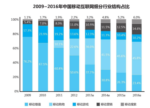 从图中可以看出,预计从2013年开始,移动电子商务将逐渐取代移动增值业务,成为移动互联网第一大细分行业。移动搜索、移动营销行业也将伴随移动互联网产业的发展,保持稳速上涨的态势,而移动游戏产业则将处于相对稳定的发展阶段,最终形成多行业并存、协同发展的新局面。