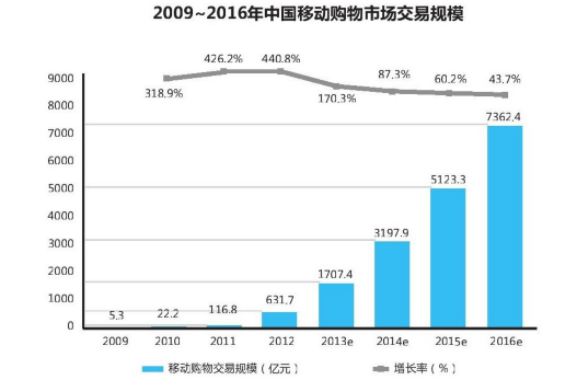 中国移动电商市场从2009年开始步入飞速发展期,仅仅经过三四年的发展,其市场交易规模就已突破631.7亿元。移动电子商务的成长,一方面是由于大屏智能手机、平板电脑的日渐普及、WIFI网络环境的改善以及移动购物的安全便利使用户移动购物体验获得较大提高。另一方面,电商企业在移动端的积极推广和价格战促销等,扩大了移动消费的影响面,客观上刺激了移动电商行业的发展,对移动电子商务的成熟也起到了不可忽视的推动作用。