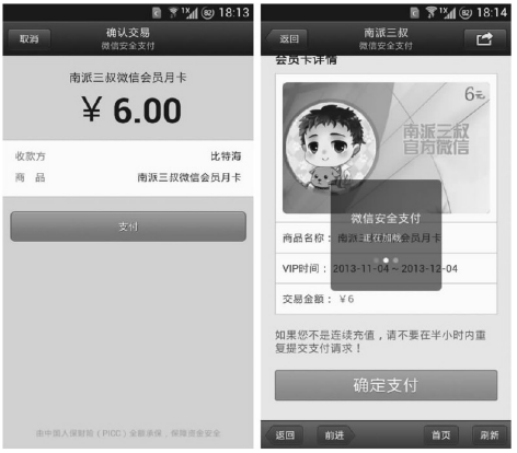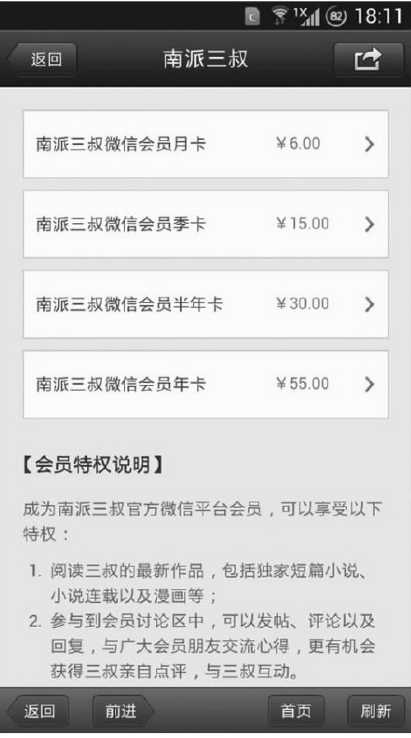 南派三叔微信公众账号的会员收费标准是包月6元、包季度15元,用户可以根据自己的需求进行定制。而会员充值途径多样,用户可以在阅读到付费章节时用微信支付直接完成,也可以购买会员充值码进行充值。南派三叔本人承认,“通过微信支付直接购买服务的读者人数,比其他渠道的高出一个数量级”。
