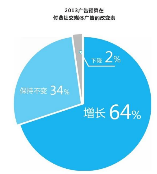现在的数字营销行业,毫无疑问已经进入了社交为王的时代。美国的广告客户,在2013年增加社交媒体投入预算的,有64%之多,保持投入不变的也有34%。也就是说只有2%的广告主,打算减少社交媒体的投入。这对于一个还算新兴的营销平台来说,是十分可怕的数字了。