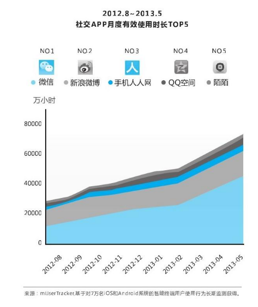 把眼光收回到国内社交类APP的月度有效使用时长排名,微信已超过微博多达至少10个月。尤其是在进入2013年之后,微信的绝对优势明晰可见,它的崛起呈直线爆发。