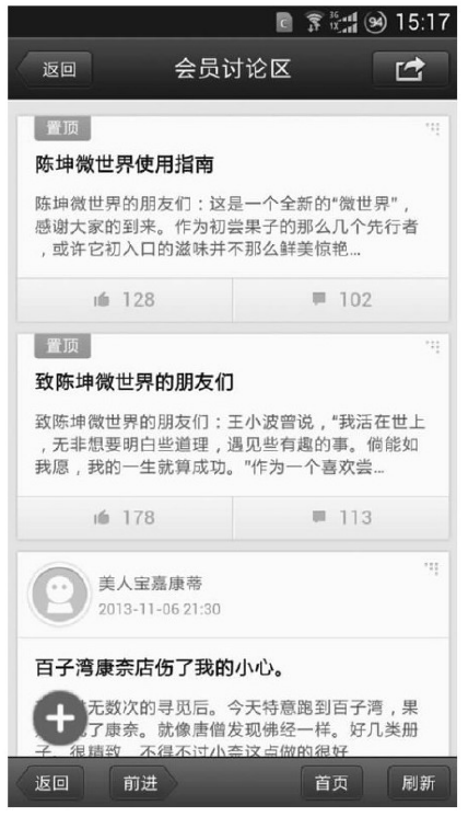 值得一提的是,陈坤的微信公众账号所提供的“会员讨论区”功能,简单地说,它就是一个论坛,提供内容发布、评论和“赞”的功能。但有趣的是,这是你第一次,在微信里能看到非好友关系发布的内容和评论了。也就是说,微信告诉我们,在不打破原有朋友圈封闭的关系设计逻辑的情况下,它们也能有办法绕开好友关系的束缚,在微信上扩展出更具价值的社交平台。这些平台当然不仅是局限于“粉丝论坛”,类似Facebook上的品牌页面、各种垂直领域的社区都可以依照这种模式建立,如果时机成熟后微信再做一个聚合页面,将它们分类展示,那也是一件挺有意思的事情。一个个垂直的、打破好友关系壁垒的社区将让微信有能力从社交平台向社会化平台扩展,发展空间极大。