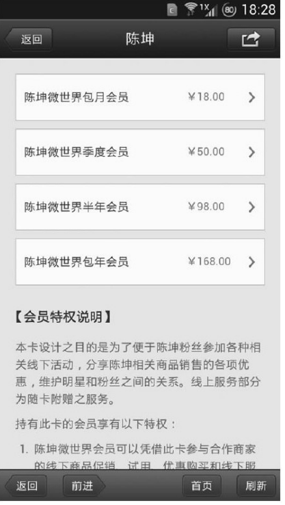 其中许多功能——譬如要想在“会员讨论区”发布信息与其他陈坤的粉丝聊天,则需要付费成为会员才可获得权限,付费金额为“每月18元、季卡50元、半年卡100元、年卡168元”,在推广这一项目时,“每月只要18元,陈坤亲自说晚安”也成为吸引粉丝掏钱的情感推动力。据称,陈坤的微信公众账号在进行功能改革后的第一天,就坐收700万人民币进账,效果惊人。腾讯官方的态度是,目前微信的明星会员制还属于试运营期,这种模式也不会仅局限于明星,未来会逐步开放给所有愿意尝试这种合作模式的企业。在试运营期间,微信也不会参与会员收入分成。