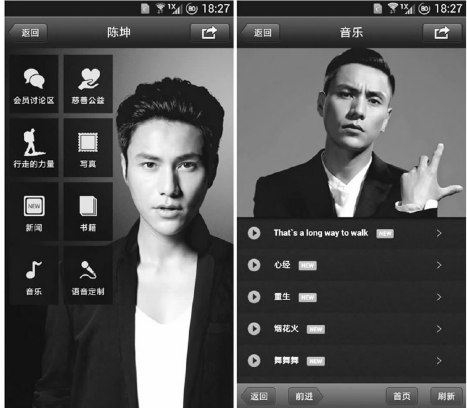 2013年9月,陈坤成为国内首个在微信上玩出新花样的明星,他将其微信公众账号委托某第三方技术开发公司,不仅从“订阅号”调整为“服务号”,而且还在公众账号内部搭建了一个移动站点,用户访问陈坤的公众账号,将在自定义菜单栏目中看到“首页”这一按钮,点击进入之后,将会进入一个全新的窗口,内含“会员讨论区”、“写真”、“书籍”、“音乐”、“语音定制”、“个人中心”等栏目,俨然就是一个表现更为丰富的陈坤个人主页。