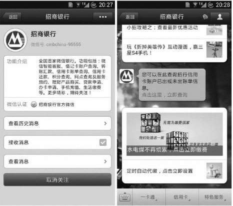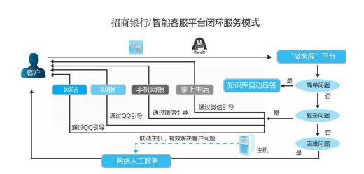 2013年4月,招商银行信用卡正式在微信上推出招商银行信用卡智能客服平台,用户将个人信息与微信账号绑定,就可以办理信用卡申请、账单查询、个人资料修改等业务,接收在招商银行信用卡上产生的所有交易信息。目前,招商银行微信顾客服务平台上能完成的服务项目为79项,包括还款、促销活动、积分等业务,占招商银行总服务项目的71%,其中90%以上的业务是用户通过自助服务完成的,在这背后,是招商银行卡中心核心业务系统、语义识别系统、知识库系统、机器人职能引擎、渠道总控系统等多个技术平台的整合与打通。