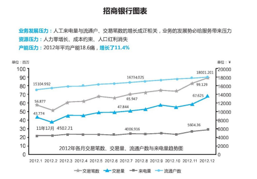 在确定可行之后,招商银行对自己的微信账号有了详细的定位思考,而这个思考其实有一半是被逼出来的。招商银行近几年来,无论是顾客群还是交易笔数,都在发生快速的增长,但是人员结构基本上在稳定阶段。这样导致现有的人工客服无法及时应对随流通户、交易笔数的增长而增长的人工来电量。业务的发展势必给服务带来压力。此外,在中国人口红利逐渐消失的大背景下,人力成本的增长也意味着服务成本的提高,这也要求招商银行的顾客服务需要拓展新渠道。谋求客服转型、希望能搭建一个基于互联网的沟通渠道平台的招商银行卡中心,决定尝试把顾客服务搬上微信平台。