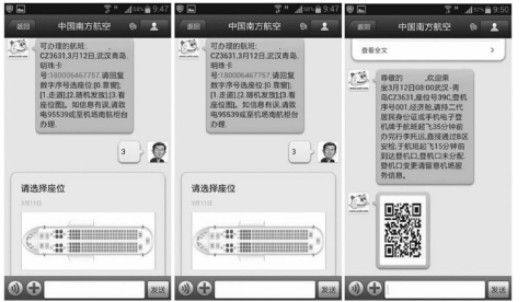 如今微信已经跟网站、短信、手机APP、呼叫中心,一并成为南航五大服务平台。微信作为一个更优异的通道,完全可以实现类似短信营业厅和电话呼叫中心的业务功能。以南航首创推出的值机服务来说,用户只需要跟随南航公众账号的回复提示,就可以便捷完成班次信息查询、座位选择、获取二维码登机牌等服务。