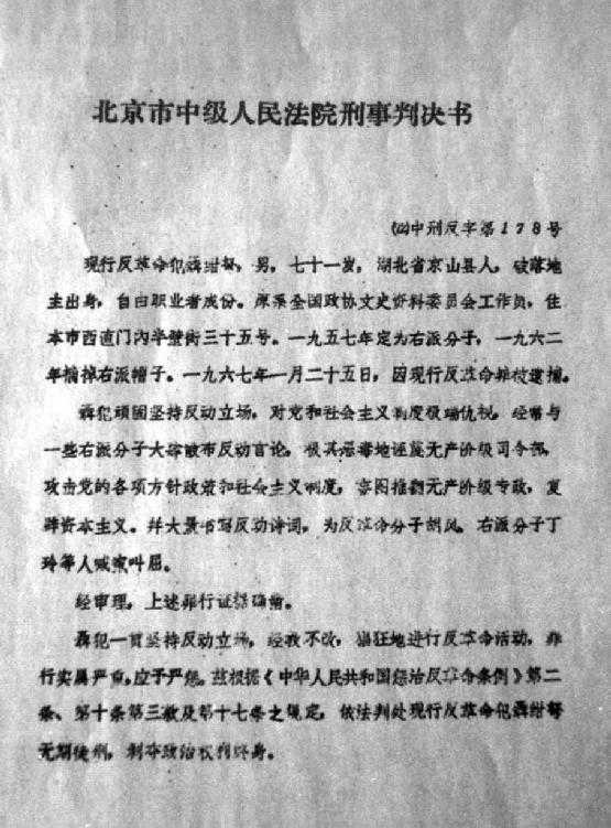 1967年1月25日,深夜,他以“现行反革命罪”被逮捕。先后关押于北京功德林、半步桥监狱,山西稷山县看守所。1974年5月8日,被北京市中级人民法院,以“现行反革命犯”,判处无期徒刑,罪名是“经常与一些右派分子大肆散布反动言论,极其恶毒地诬蔑无产阶级司令部……并大量书写反动诗词,为反革命分子胡风、右派分子丁玲等人喊冤叫屈”。这一年10月底,转押临汾市山西省第三监狱。