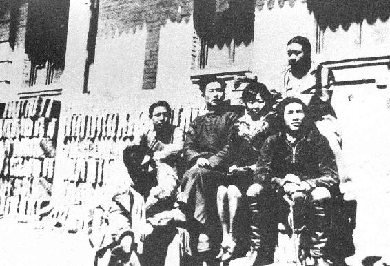 1938年,聂绀弩(中左二)与丁玲(后)、萧红(中右二)、田间(中左一)、端木蕻良(中右一)、塞克(前)摄于西安