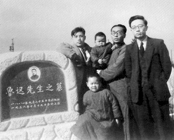 1948年,林辰(抱小孩者)与范用、刘川等人摄于鲁迅墓前