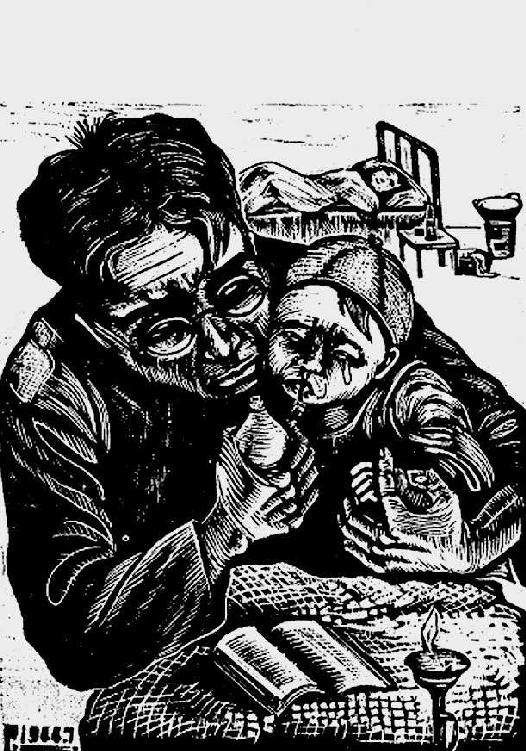 木刻《林辰之家》,刘平之作于1944年7月。当时,林辰主要靠教书的微薄薪金维持生活,又常失业,一家五口,流离转徙,经济极为拮据。