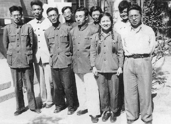 1954年春,蒋路(左三)与伍孟昌(左四)、许磊然(左六)、刘辽逸(右一)、孙绳武(左一)、文洁若(右三)等人文社同事合影