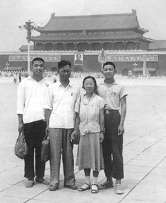 1969年韦君宜去“干校”前,与丈夫杨述,儿子杨都(左一)、杨飞(右一)在天安门广场留影