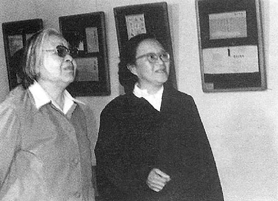 1982年,韦君宜(右)陪同丁玲参观人文社书籍封面插图展览