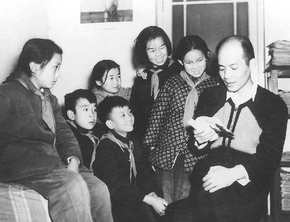 20世纪60年代,北京新鲜胡同小学少先队员听严文井朗诵自己的童话作品,《中国少年报》记者何秉洁摄