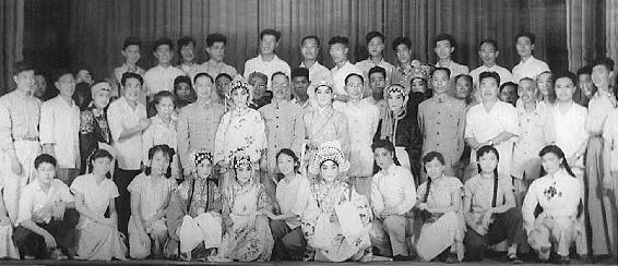 1959年,孟超(二排右三)与康生(二排左八)、曹轶欧(二排左五)夫妇,以及梅兰芳(二排左六)等人观看青岛茂腔剧团演出后与演职员合影