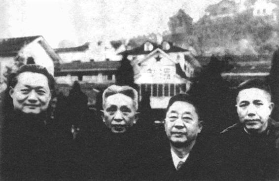 1957年1月,巴人与老舍(右二)、叶君健(左一)、周扬(右一)在重庆南温泉
