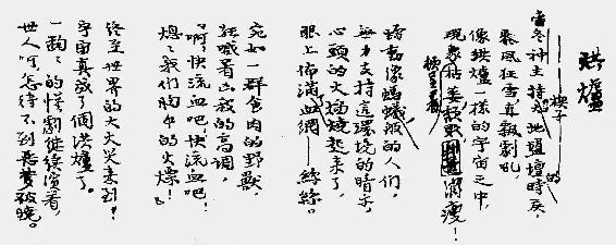王克平在整理父亲的遗物时,发现他留下的手稿,数量惊人。1949年之前的诗稿,包括三部叙事诗《洪炉》、《髑髅哀歌》、《印度尼西亚之歌》都是用蝇头小楷,写在毛边纸上,共有几大册。还有长篇小说稿《明日》、《女工秋菊》,散文诗稿《我们将以时间为马》,以及其他小说、评论和翻译手稿,等等。