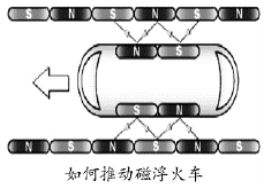 磁浮火车是怎样被推动的?下面介绍一种设计。移动的列车带动超导磁铁在导槽两边的线圈感应出电流,根据这些信息,系统便会把交流电输入导槽两边的推进线圈,产生南北梅花间竹的磁极(如图),对超导磁铁造成拉力和推力,使列车加速。磁浮火车能悬浮在路轨上行驶,免除了火车与路轨之间的摩擦力,故能以高速飞驰。估计未来的磁浮火车能以高达500千米/小时的速度行驶。此外,磁浮火车无噪音。磁浮火车也有缺点,就是建造导轨的费用昂贵,磁浮火车只能在这些导轨上走,极大地限制了它的发展。