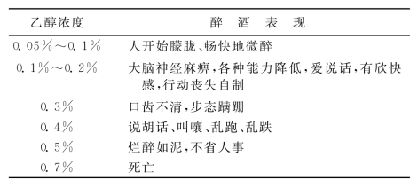 表4-1 血液中乙醇浓度与醉酒表现的关系