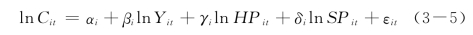 弗里德曼的持久收入假说和莫迪利安尼的生命周期假说已经成为经济学家研究消费问题的基本理论框架,其核心思想是:家庭的消费决策不仅取决于当期收入,而且还取决于其他时期的收入,或整个生命周期的收入。而家庭实际持有的财富价值是家庭整个生命周期收入的重要组成部分。根据莫迪利安尼提出的消费函数,本章把房地产财富和股票财富分开,在控制住了股票财富情况下检验我国30个大中城市房地产价格财富效应,建立如式(3-5)所示面板计量模型: