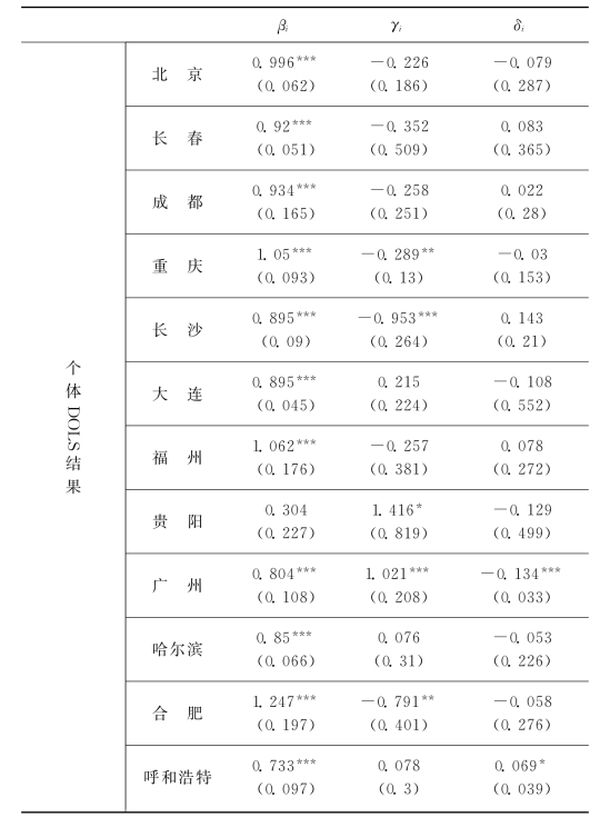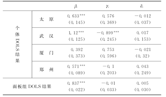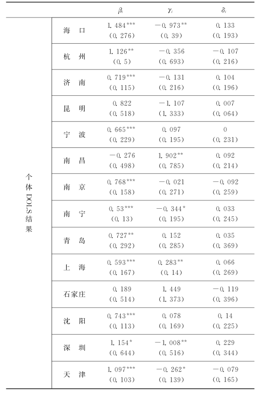 接下来采用面板DOLS方法来估计四个变量之间的协整方程式(3-5)中的系数大小,通过γ系数的正负及大小来判断我国各大中城市房地产财富对消费产生的是支持还是抑制作用以及作用的大小。利用Gauss 8.0软件编程处理,结果如表3.8所示。