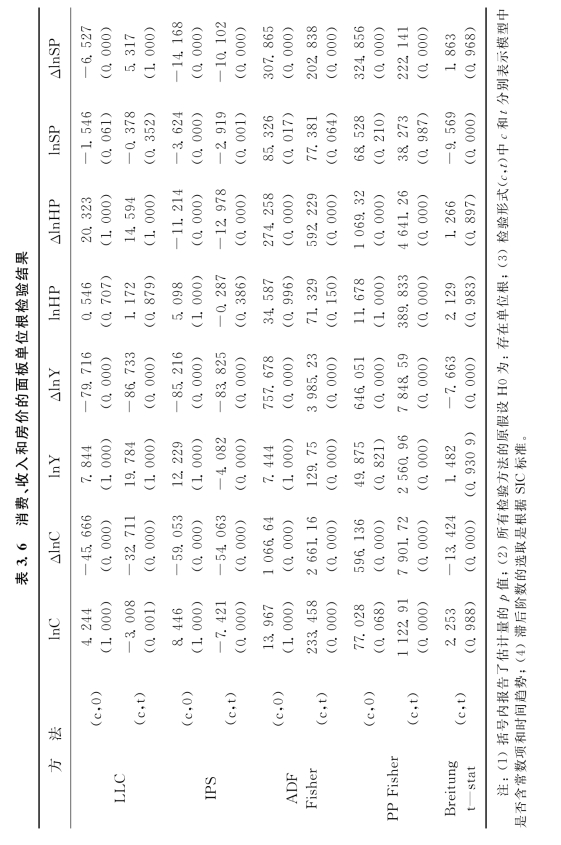 为增强检验结果的稳健性,我们同时采用LLC、IPS、ADF-Fisher、PP-Fisher和Breitung方法分别对消费、收入、房地产财富和股票财富的原序列和一阶差分序列进行面板数据单位根检验,并且对含截距和带时间趋势模型都进行了检验,以综合考虑各个统计检验的结果来检查这些数据是否平稳。表3.6给出了各面板数据单位根检验方法的检验结果。