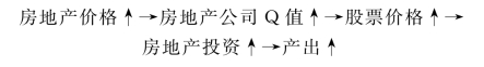 房地产价格上升,一方面会直接提高房地产市场价值与其重置成本的Q比值,当Q值升高且大于1时,房屋的边际收益率的提高将会吸引开发商建造更多的新房,从而刺激房地产投资支出增加,带动总产出的增加;另一方面会提升房地产上市公司以及其他拥有较多房地产的上市公司(如商业类、酒店类上市公司)的投资价值,推动其股票价格的上涨,使得托宾Q效应发挥作用,引致该类企业投资支出增加。房地产价格上涨的Tobin'Q效应如下:
