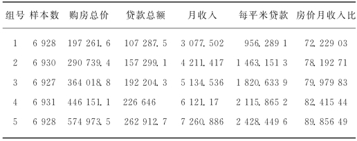 为了考察房价和抵押贷款之间的关系,依据“每平米房价”对样本进行五分组,依据“每平米房价”由低到高排序,平均分成五组,依次表示为低房价、中等偏低房价、中等房价、中等偏高房价和高房价五组,依次用组号1~5来表示。不同组中主要指标的均值如表5.2所示。