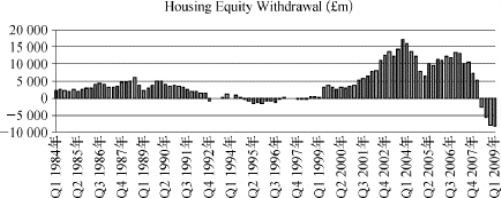 依据英国银行数据(见图5.2),从20世纪90年代,伴随着房地产价格的下降,住房资产增值抵押借款几乎停止了,但从90年代末以来随着房价的上涨,资产增值抵押借款也随之上涨。自1999年第二季度以来,英国家庭以住房作抵押的借款金额远大于新的住房投资所需金额,2000~2003年资产增值抵押借款相当于居民可支配收的4%,资产增值抵押借款在2003年第四季度增至173亿英镑,创下历史最高,2005年因房市降温而下降,2006年在房市复苏的带动下再度上升,2007第一季度资产增值抵押借款还高于2006年同期的116亿英镑,但从第二季度开始快速下降,到2008年第二季度以来资产增值抵押贷款为负值,并且连续创新低。