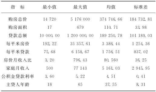 在基本信息基础上,本书设计指标“每平米房价”(简称“房价”)、“每平米贷款”和“房价月收入比”。“房价”是指居民所购买住房的每平米房价,由购房总价除以购房面积计算得到,代表房价高低。“每平米贷款”是指居民所购住房每平米的抵押贷款额,由公积金贷款金额加上商业贷款金额得到“贷款总额”,再除以购房面积计算得到,代表居民所购住房每平米抵押贷款的高低。“房价月收入比”是由购房总价除以贷款申请时的月收入(如果有合贷人,则为主贷人和合贷人的月收入之和),表示收入对家庭所购住房价值的影响。样本主要指标的描述性据统计结果如表5.1所示。