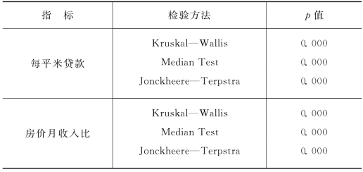由表5.2可以看出,房价越高的组,居民所购住房的总价、贷款总额、每平米贷款额度和房价月收入的均值也越大。但这种趋势是否具有统计上的显著性?在不知总体分布的情况下,我们选择多独立样本非参数检验方法,来分析“每平米贷款”和“房价月收入比”这两个指标在房价五组下的分布和中位数是否相同。
