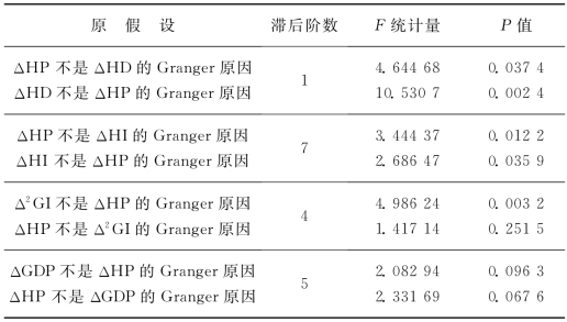 表5.5 HP和HI、HD、GI、GDP之间的Granger因果关系检验