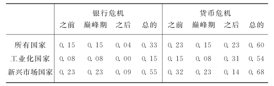 注:数据来源于资料来源于Mendoza &Terrones(2008)。其中,“银行危机”的定义见Demirguic-Kunt &Detragiache(2006)。“货币危机”定义见Eichengreen &Bordo(2001)。“之前”表示巅峰期前三年,“这后”表示巅峰期后三年,“总的”表示在巅峰期前后七年中发生的概率。