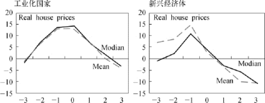 注:资料来源于Mendoza &Terrones(2008)。横轴刻度0代表信贷扩张巅峰发生的基期,刻度单位为年。左图为工业化国家实际房价波动项的均值和中值,右图为新兴经济体实际房价波动项的均值和中值。