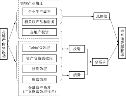 正是房地产独特的双重属性特征,紧密地将其价格波动和普通物价水平联系在一起。一方面,作为实物消费品,房地产价格对上下游产品的价格具有传导作用;另一方面,作为金融投资品,其对普通家庭消费需求和企业投资决策,以及银行信贷扩张都有重大影响,致使社会总需求发生变化。国外很多实证研究也发现,相比较于股票价格、外汇等纯粹的金融资产,房地产价格波动与未来通货膨胀率之间有着更加紧密的关系。我们把房地产价格变动对通货膨胀的作用渠道用图7.1来描述,接下来分别从房地产的实物资产角度和金融资产角度来分析房价波动通过什么渠道影响未来通货膨胀。