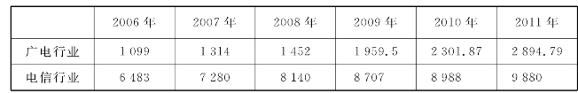 数据来源:广电总局2006—2011年《中国广播电影电视发展报告》、工业和信息化部2006—2011年《全国电信业统计公报》。