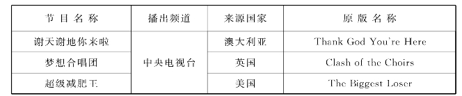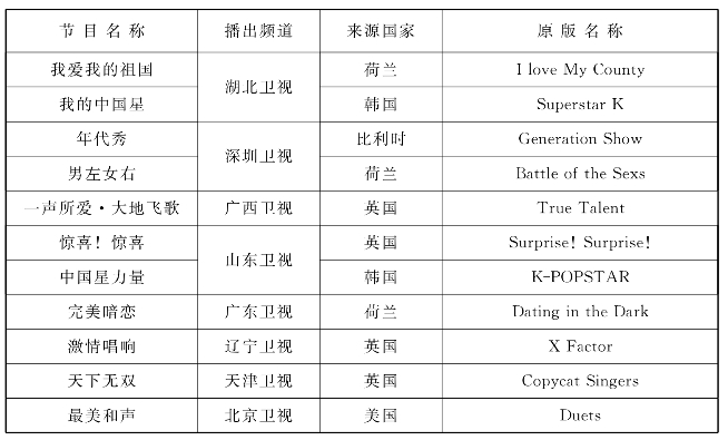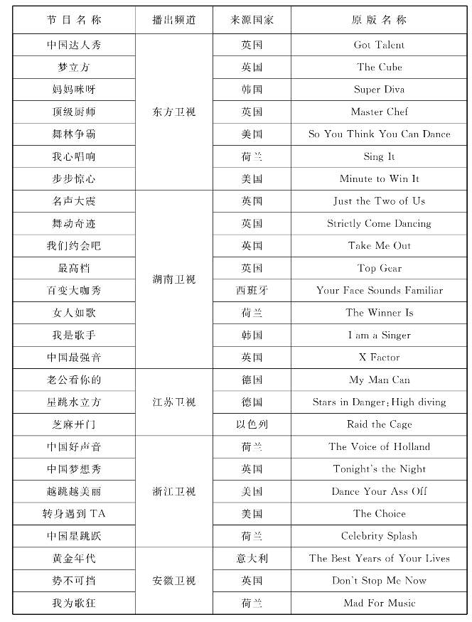 近年来,我国电视节目“模式引进”如火如荼(表2—2)。2010年被世熙传媒总裁刘熙晨称为我国“模式启蒙年”[32],代表为购买Fremantle Media公司节目版权的《中国达人秀》和借鉴《Take Me Out》的《非诚勿扰》。2011年,各电视台从引进节目开始发力。中央电视台从英国Fremantle Media公司引进版权,制作了《谢天谢地你来啦》;湖南卫视《舞动奇迹》第三季上演,同期播出的引进版权模式的节目还有《称心如意》、《我们约会吧》和《最高档》;5月,东方卫视《中国达人秀》第二季登场,《我心唱响》也随之起航;浙江卫视高调推出了《中国梦想秀》,主打平民梦想牌,节目引自英国BBC综艺节目《就在今夜》;山东卫视引进《Surprise!Surprise!》,上星节目直译为《惊喜!惊喜!》;辽宁卫视推出中国版《X Factor》——《激情唱响》;深圳卫视《年代秀》引自比利时综艺节目《Generation Show》的模式;东南卫视则一举引进三个节目,分别是《欢乐合唱团》、《明天就出发》、《朋友就该这样》。2012年,湖北卫视从荷兰塔帕传媒集团购买了《我爱我的祖国》的中文版权,引进整体节目制作模式,荷兰方派制作人到湖北武汉对栏目组人员进行培训。安徽卫视联合光线传媒引进Fremantle Media公司的节目《Don’t Stop Me Now》,推出新才艺竞技节目《势不可挡》。该年,引自荷兰音乐节目《The Voice of Holland》的模式标杆节目《中国好声音》的蹿红引起业界对模式的广泛关注,电视节目模式的竞争愈演愈烈,模式节目急剧增长,竞争激烈。2013年,湖南卫视《我是歌手》、江苏卫视《星跳水立方》、东方卫视《中国梦之声》、湖南卫视《中国最强音》、北京卫视《最美和声》等纷纷推出,模式节目常态化已经成为一大创新趋势。