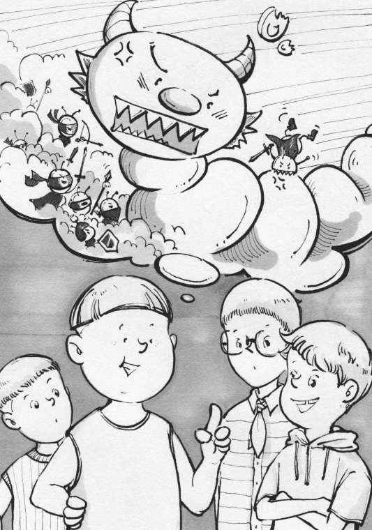 “你们别看黑衣人小,它可一点也不在乎青面兽。青面兽正要走开,黑衣人扑上去就咬了一口。唉,到底太小了,这一口,简直就是给青面兽挠痒痒。青面兽把身子那么一扭,黑衣人就被甩出去老远。